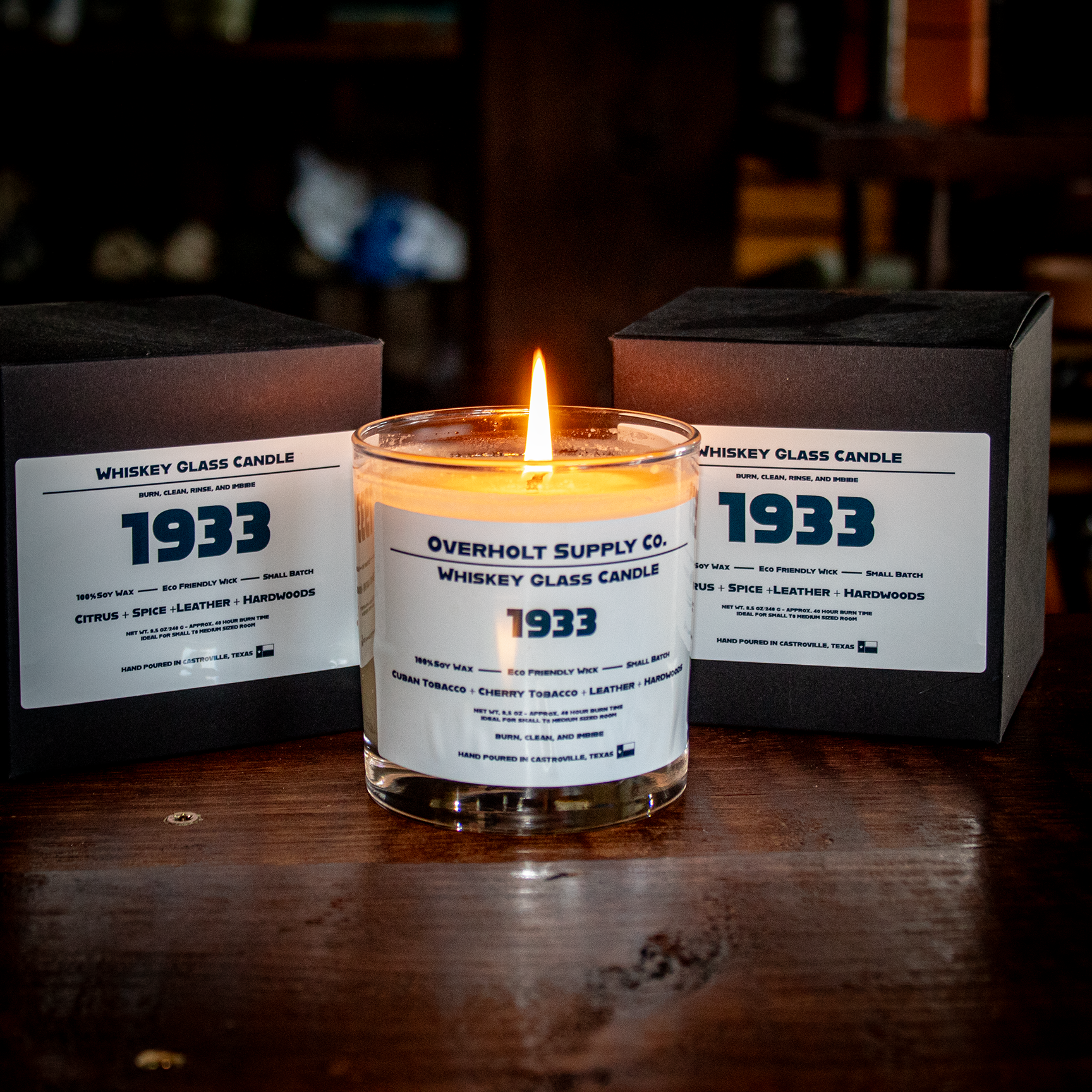 Experience the nostalgia of the 1930s with our Prohibition's End 1933 Whiskey Glass Candle. This 100% soy wax, hand-poured in Texas, candle offers a unique blend of citrus, spice, hardwoods, and leather scents that transport you back in time.