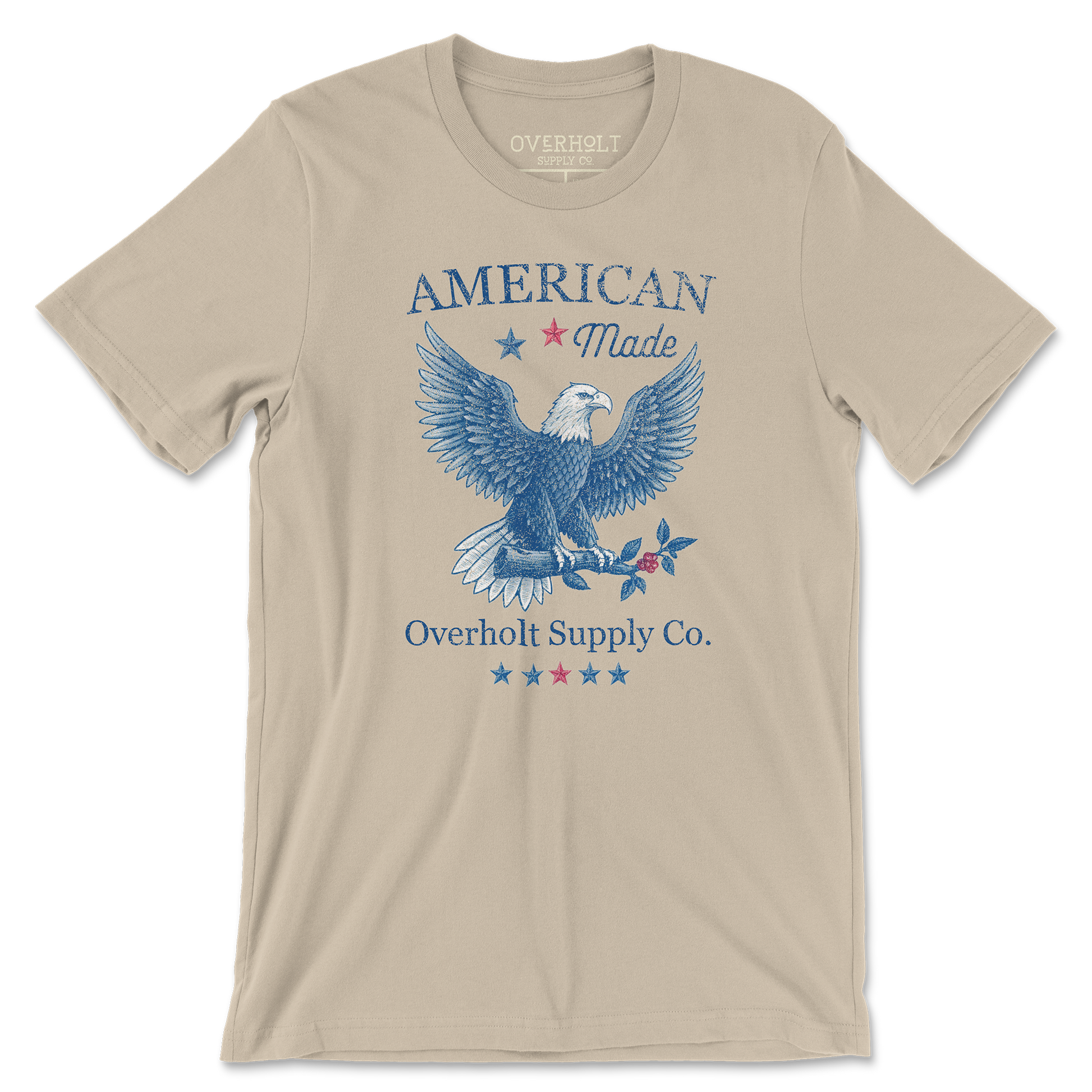 Show your pride in the land of the free and the home of the brave with this vintage-inspired design. Featuring a majestic eagle perched on a branch, framed by stars and bold "American Made" text, this t-shirt celebrates craftsmanship and heritage.