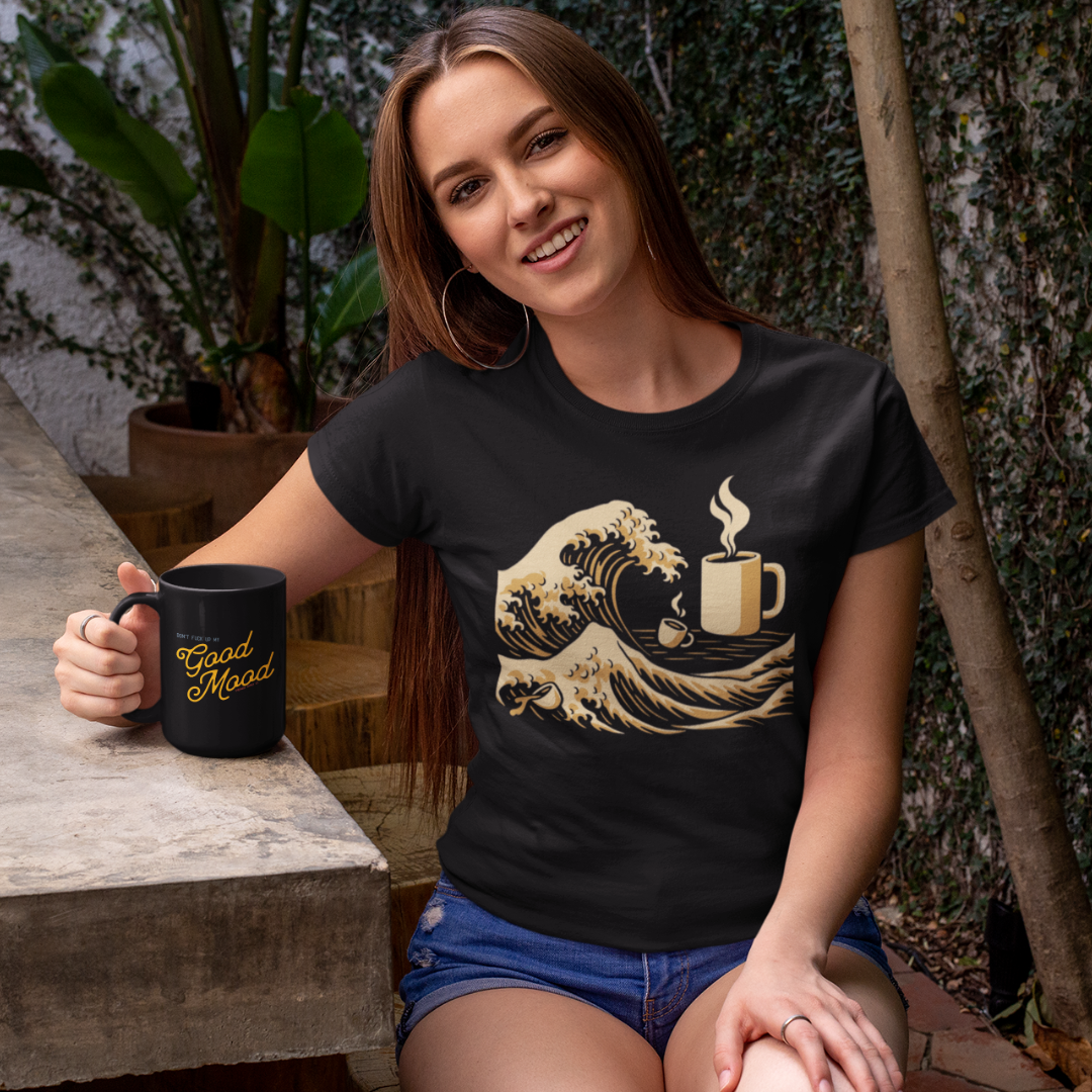 Inspired by Hokusai’s iconic “The Great Wave off Kanagawa,” this Overholt Supply Co. design takes a playful twist by swapping ocean water for steaming coffee. Frothy crests, coffee cups spilling over, and that unmistakable surge of energy we all know and love.