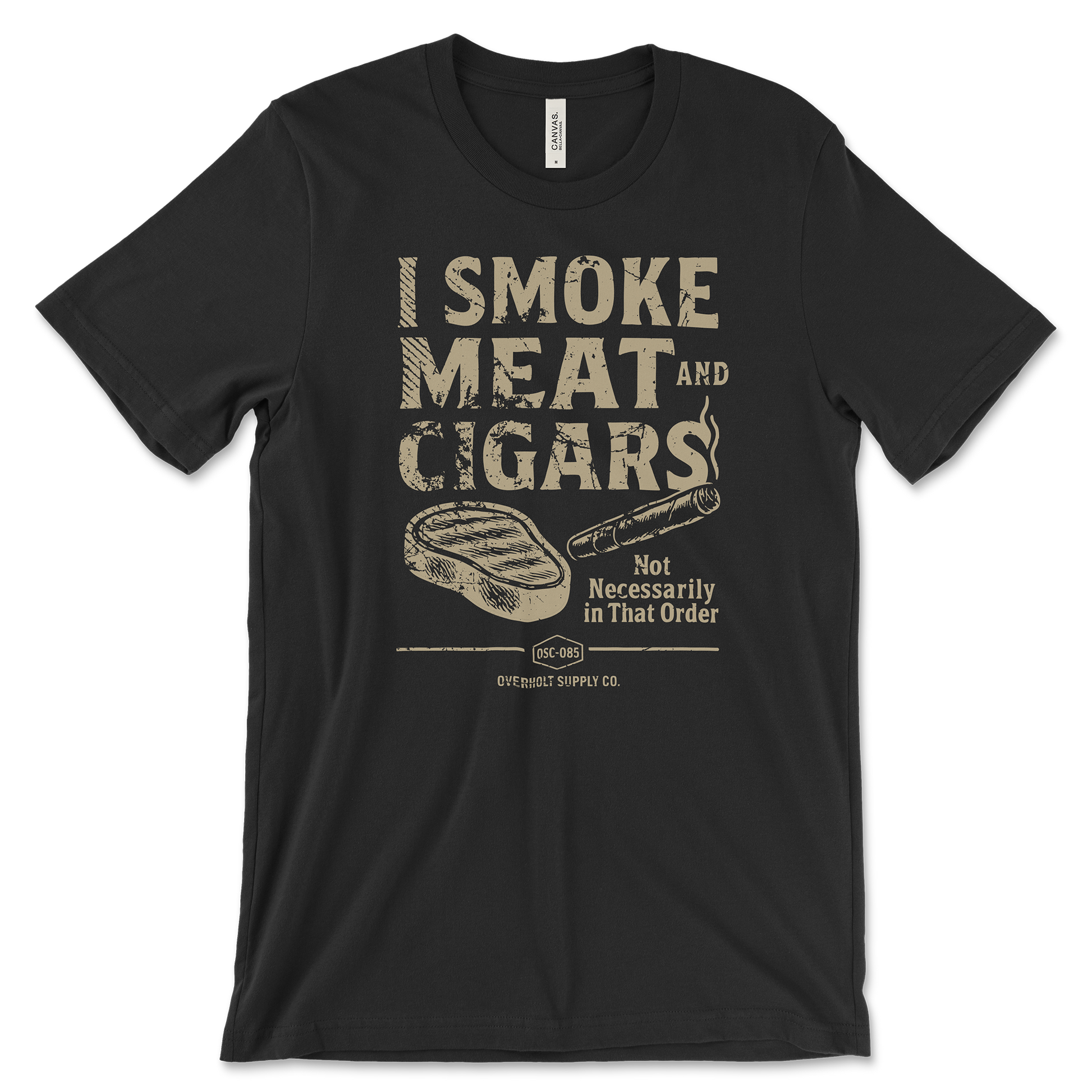 Featuring a vintage-style butcher print design with a bold, blocky font and a seared steak/cigar combo front and center, this Overholt Supply Co. original is screen-printed in-house on a super soft, pre-shrunk black tee.