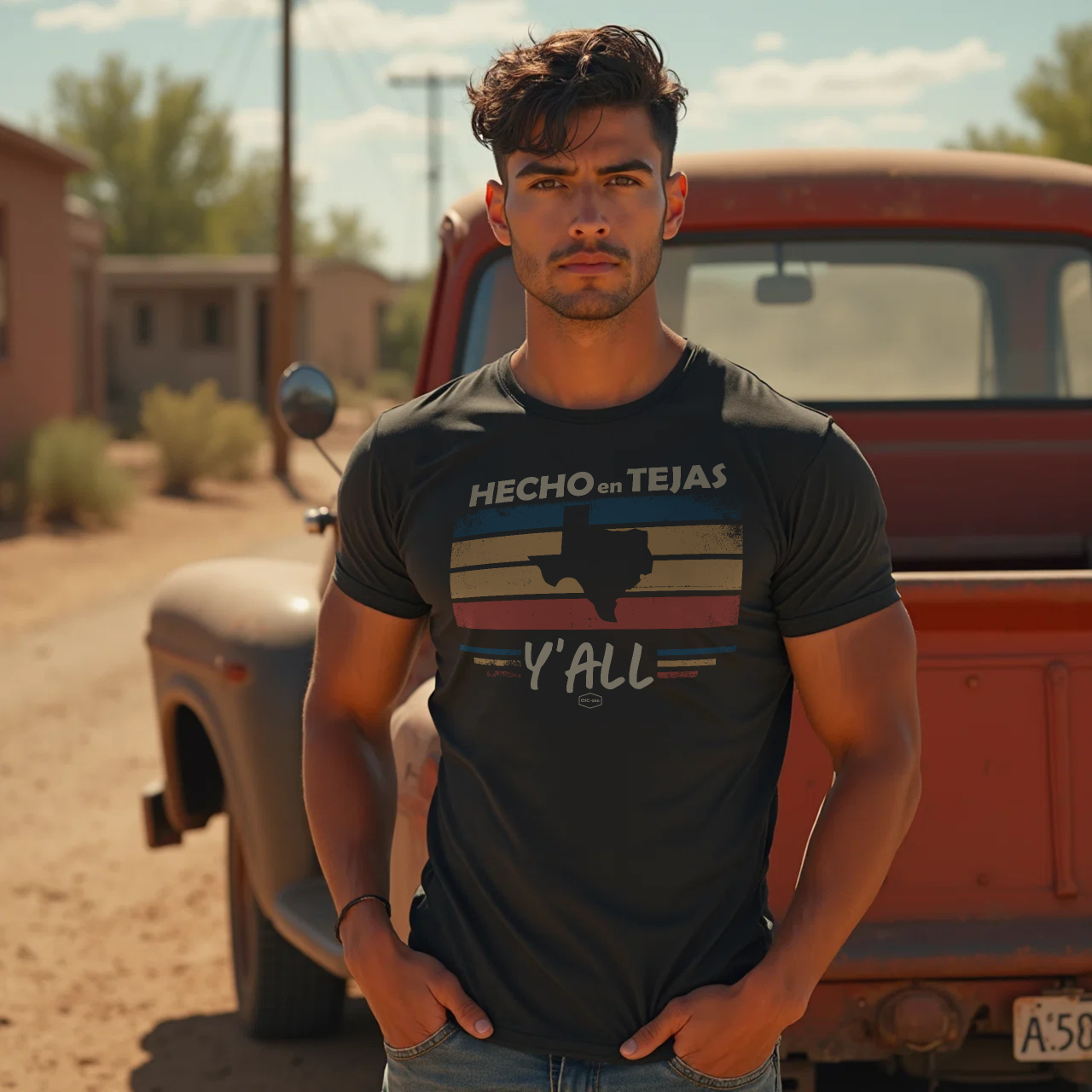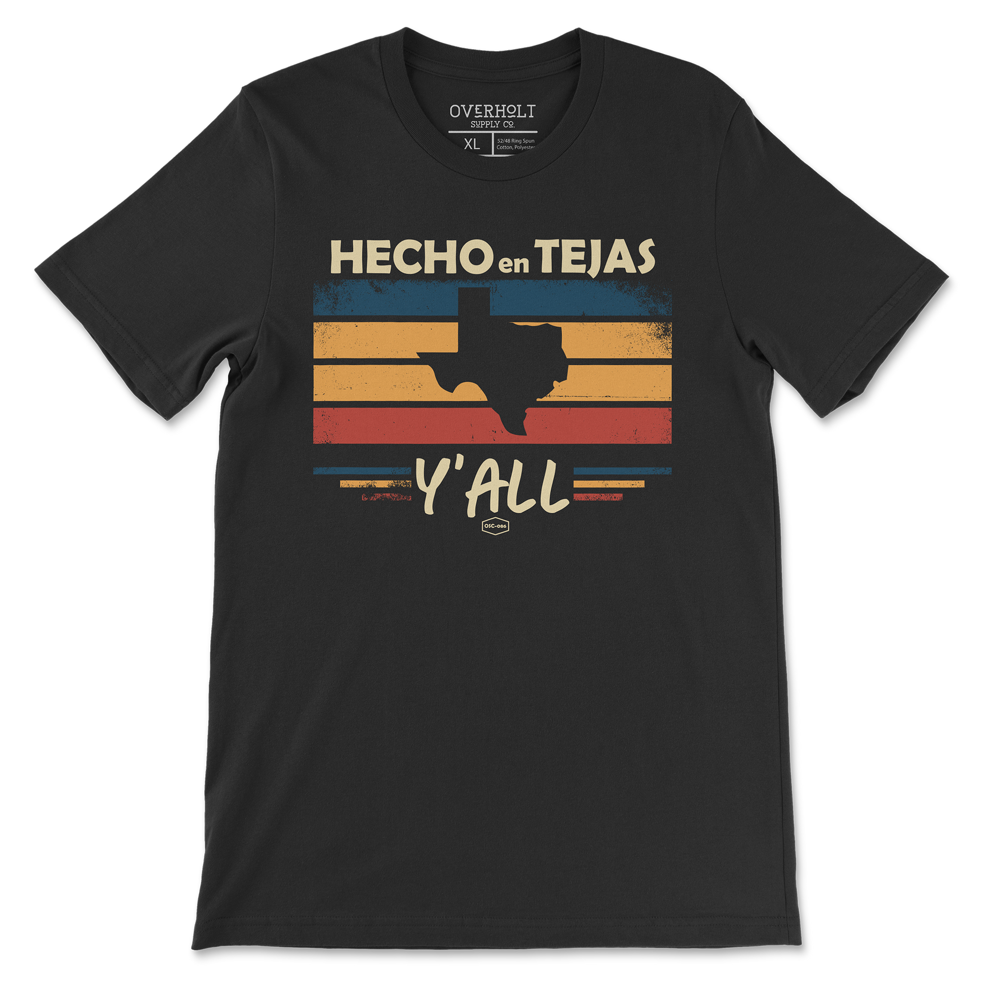 Version 2.0 of our “Hecho en Tejas Y’all” tee brings a cleaner, sharper update to one of our most iconic designs. Featuring a bold Texas silhouette layered over vintage-style stripes in navy, mustard, and red, this shirt proudly blends heritage with attitude.