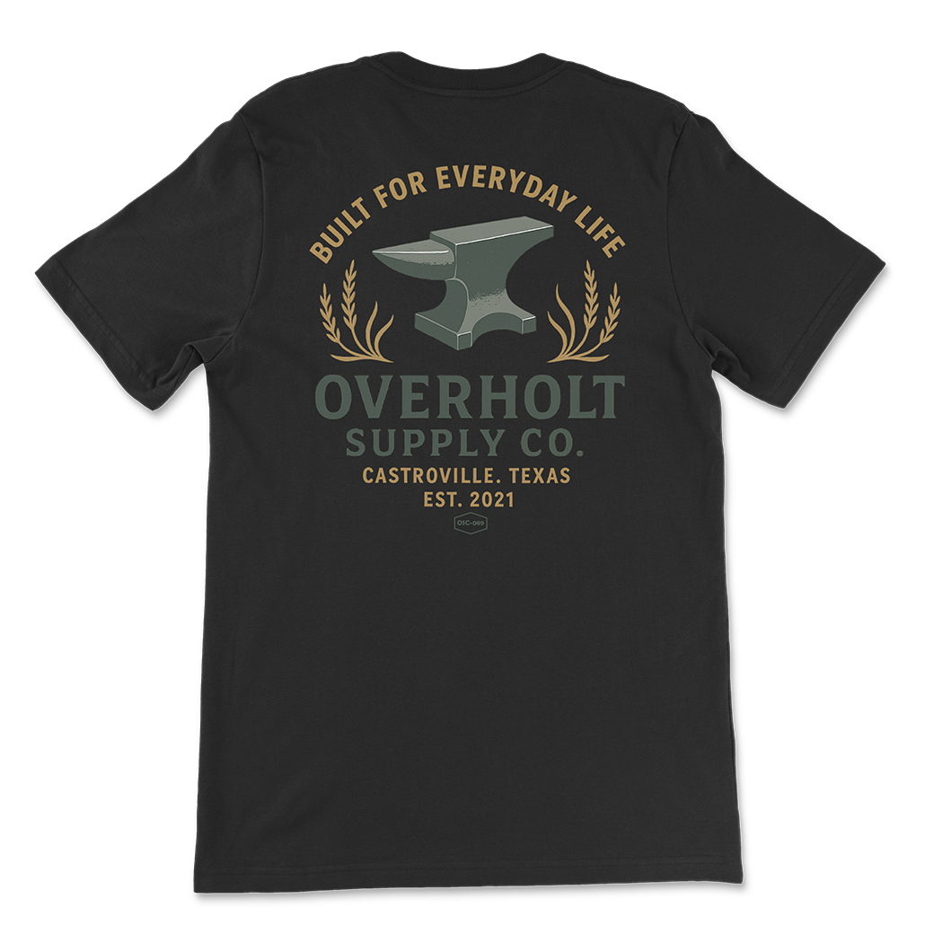 The “Built for Everyday Life” tee is a nod to the makers, fixers, grinders, and go-getters — the ones who don’t mind a little dirt under the nails. Featuring a bold back print with our Overholt anvil mark and Castroville roots, this shirt is as dependable as the folks who wear it.