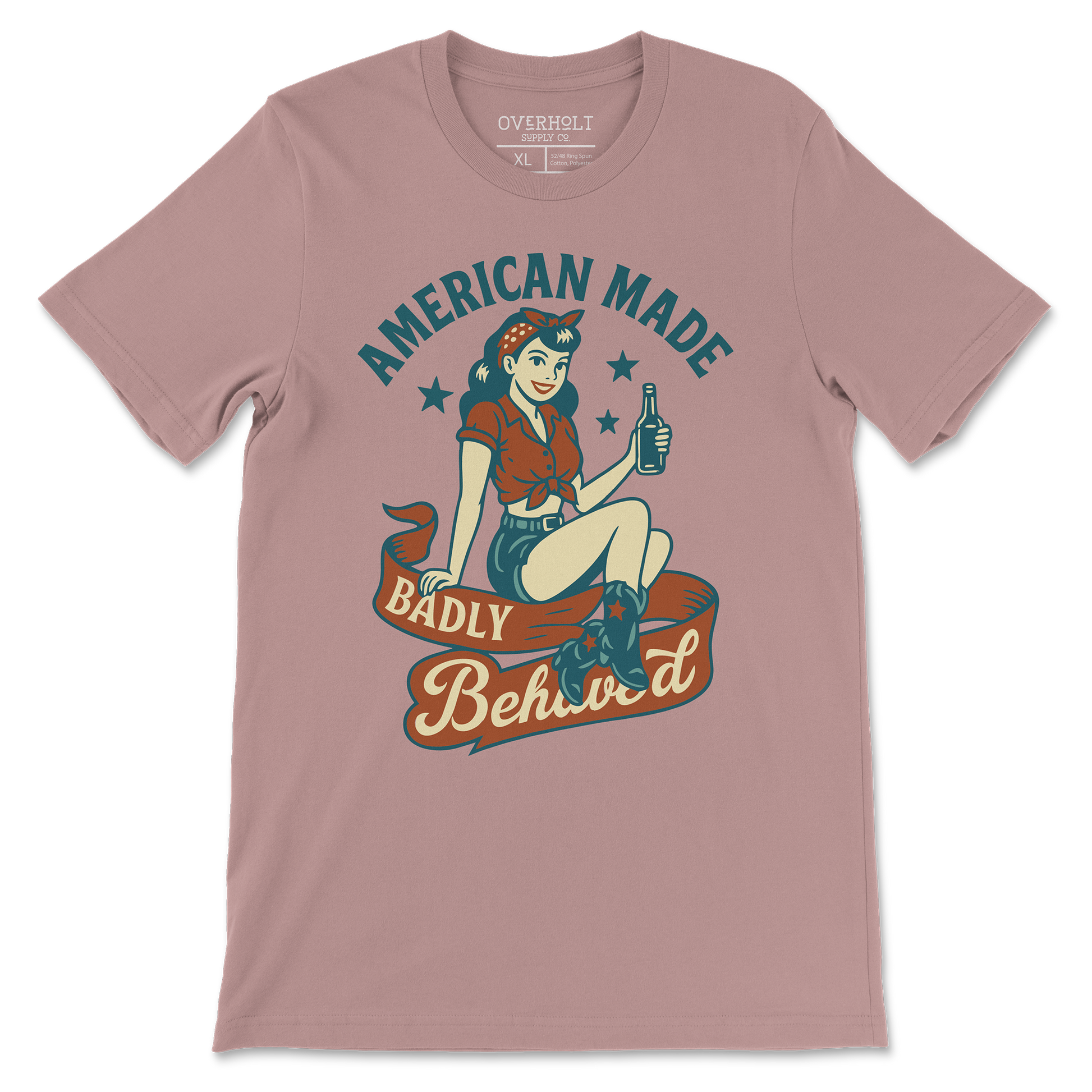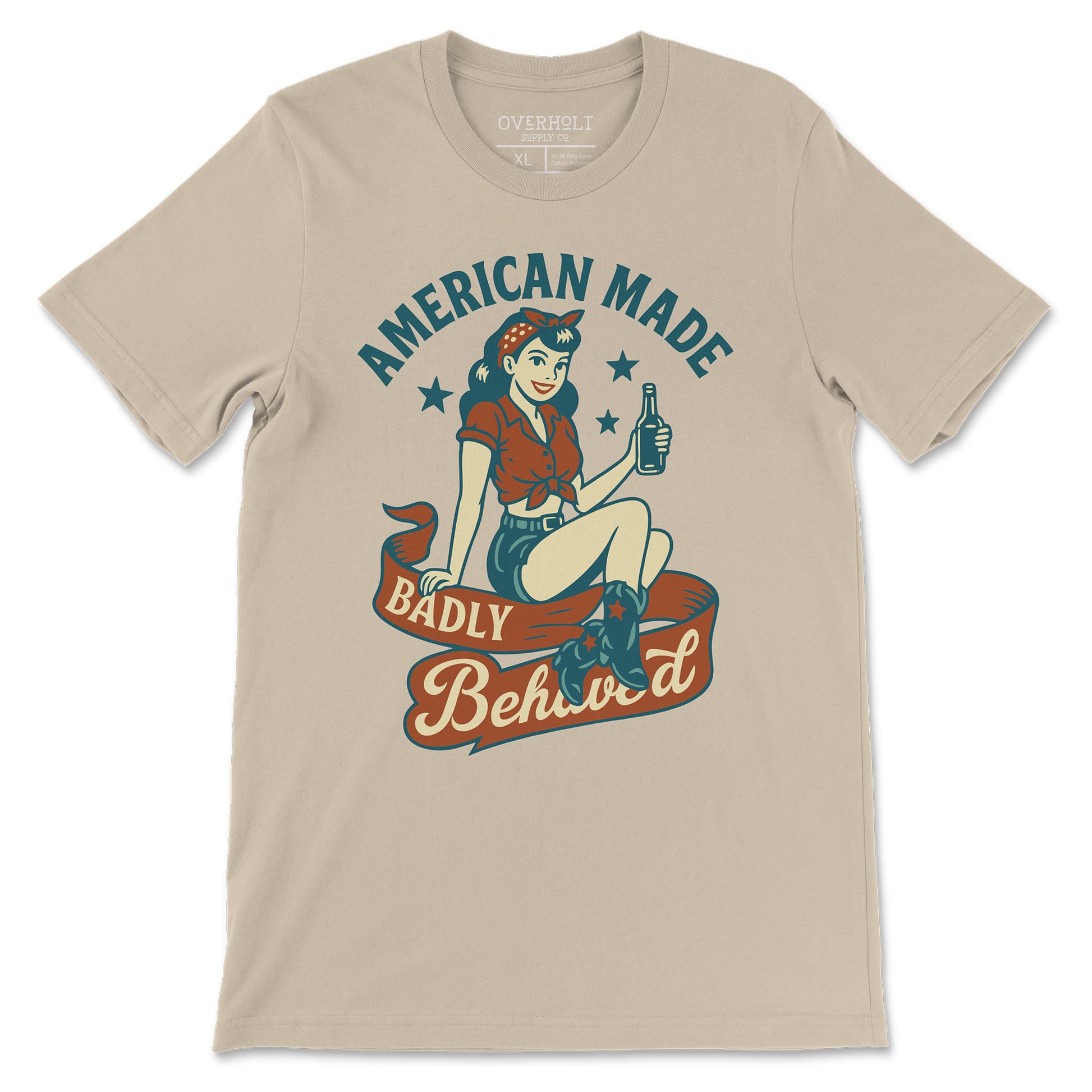 The American Made, Badly Behaved tee is for the women who were raised right—but don’t always act like it. Featuring a retro pin-up with sass in her stance and whiskey in hand, this shirt proudly reps stars, stripes, and just enough attitude to keep things interesting.