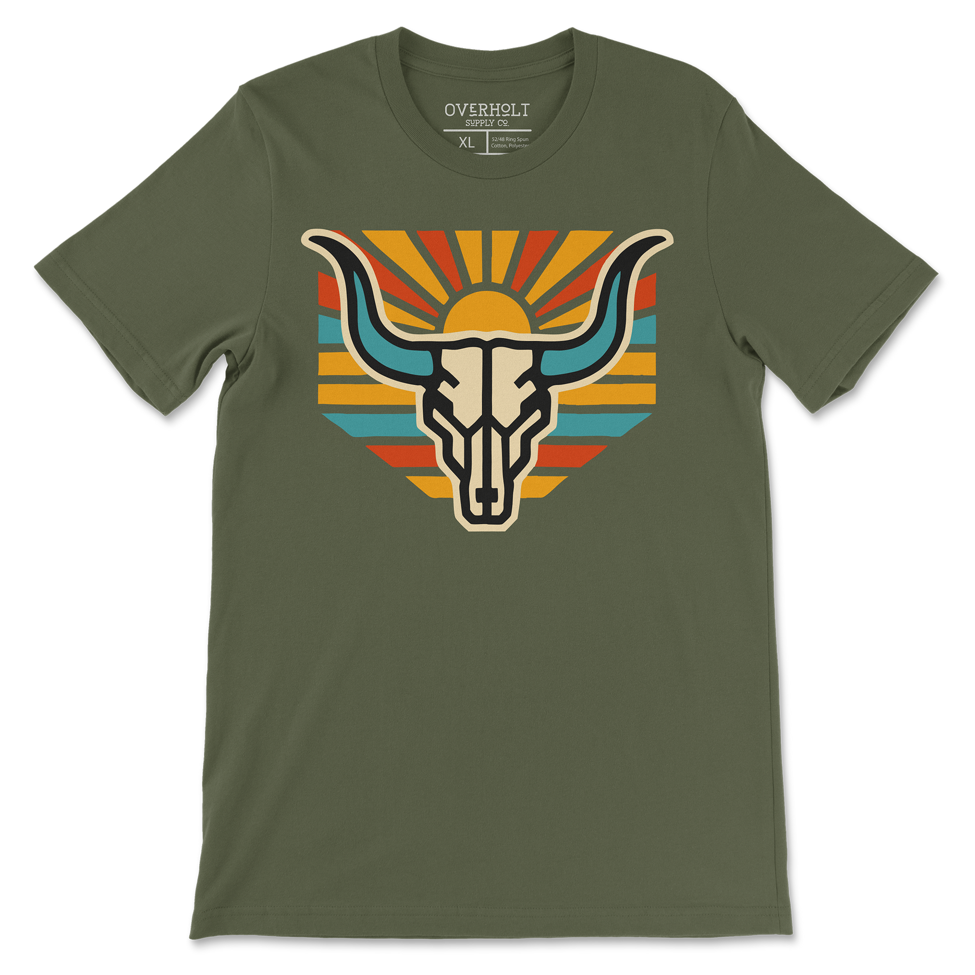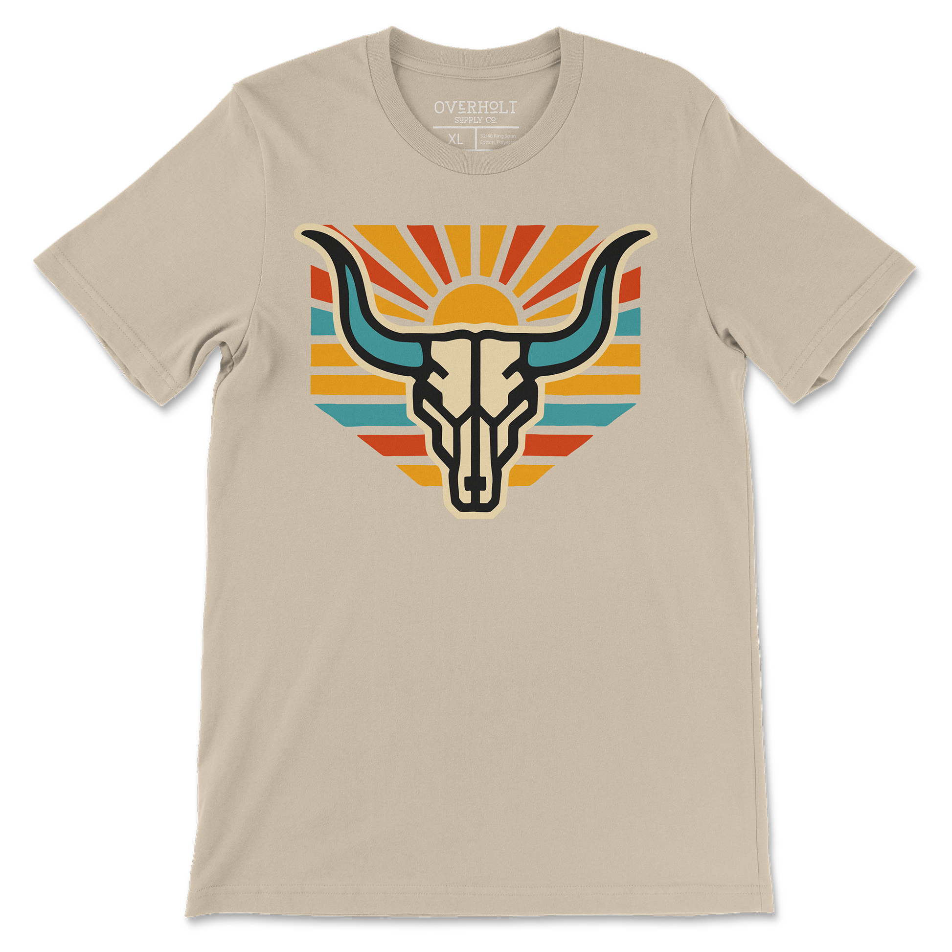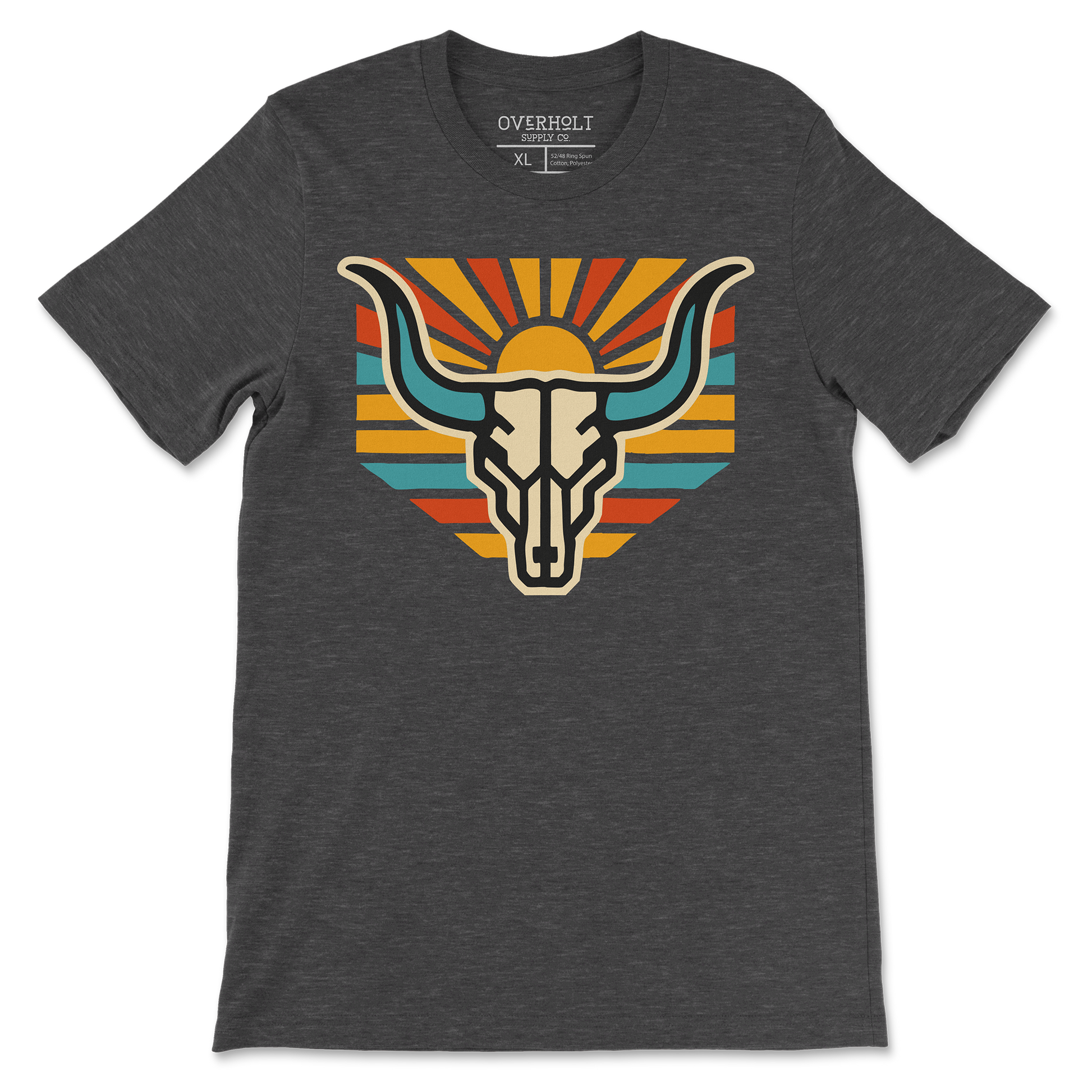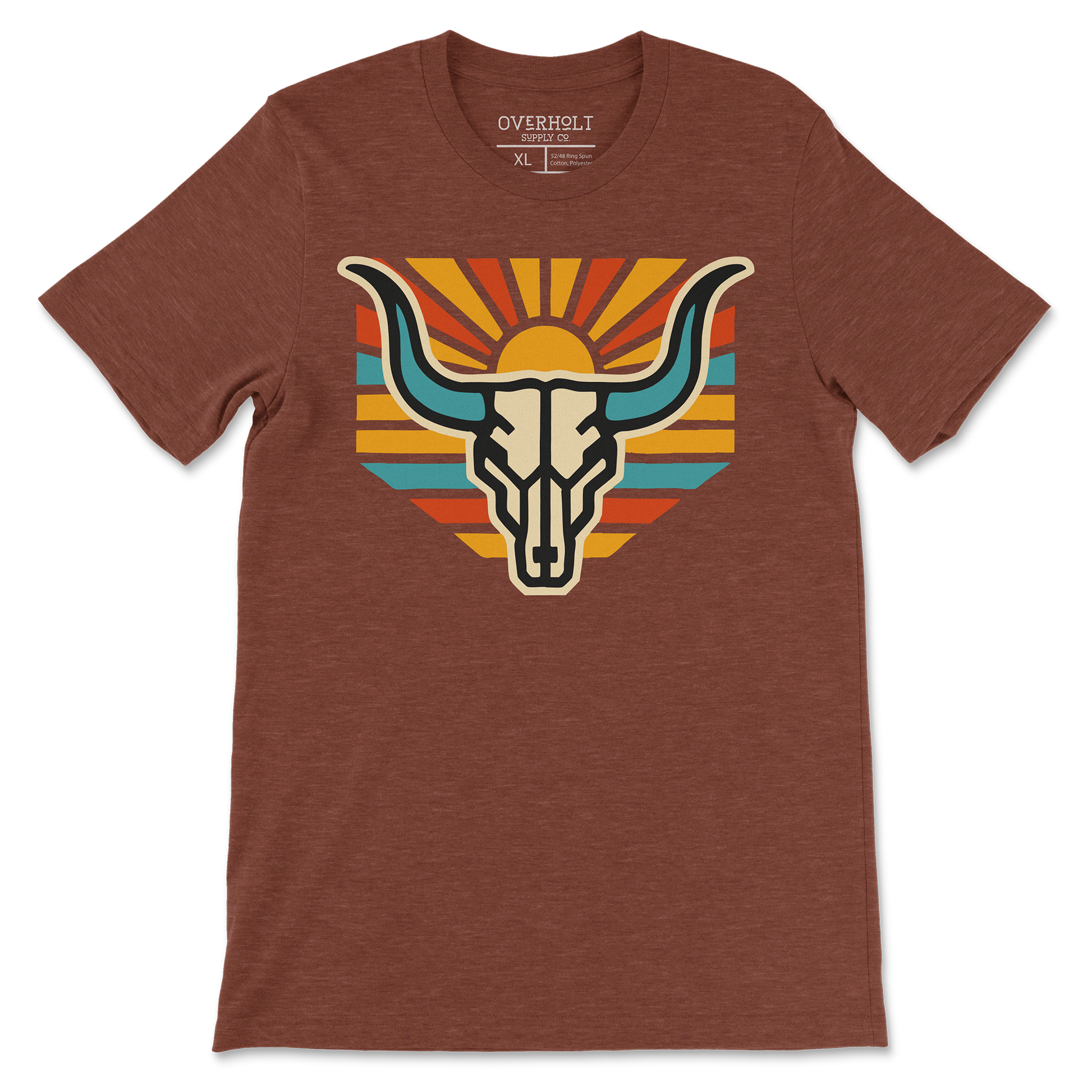 Big horns. Big heat. Big sky. A longhorn skull stamped front and center like a badge of honor—part roadside memorial, part outlaw declaration. Framed in a stripe stack straight from a 1970s motel ice bucket. Ain’t subtle. Ain’t trying to be.