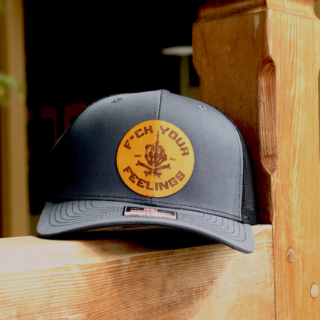 Stand out from the crowd with the Richardson Hat with "Fuck Your Feelings" Leather Patch by Overholt Supply Co. This bold hat is a true statement piece, embodying a rebellious spirit and a love for American-made products.