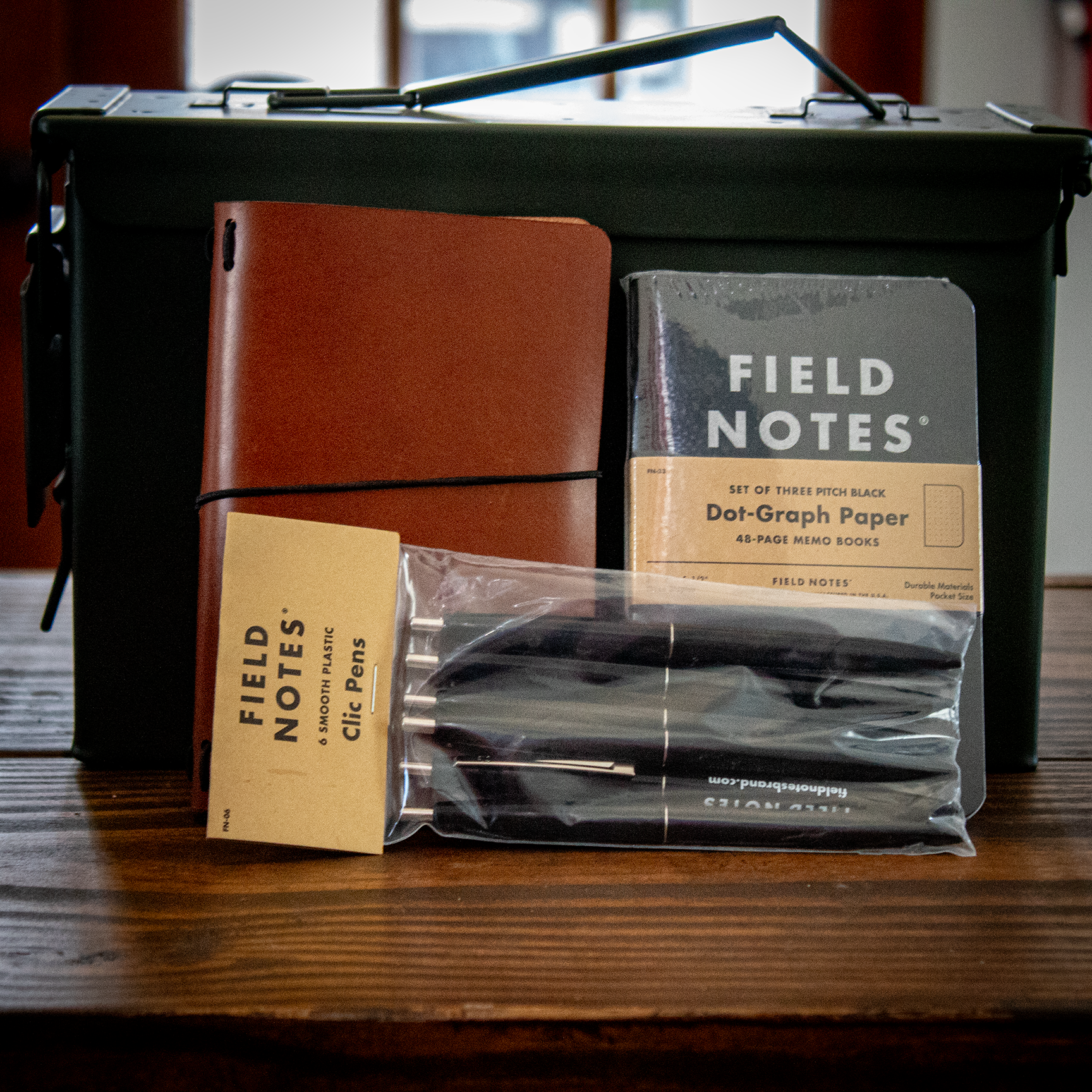 For the budget traveler we have our Traveler Lite Bundle. Included in this is our Wimberly Pocket Notebook with three pocket sized notebooks already included, then we add in a 3-pack of the Pitch Black dot graph Field Notes Notebooks, and a 6-pac of Field Notes Brand Clic Pens. All packed up in our .30 Caliber OSC Ammo Can.