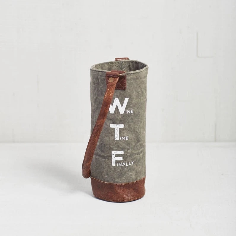 Made from durable up-cycled canvas, patterned polyester rug fabric, and trimmed with vegan leather, this wine bag is more than a carrier—it’s a conversation starter. Whether you’re bringing a bottle to the party or gifting a favorite vintage, this rugged tote adds a personal touch with real character.